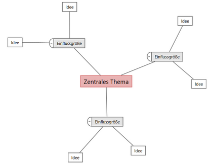 Verwandte Ideen und Konzepte werden visuell organisiert. Vom Zentralen Thema zweigen Konzepte (Einflussgrößen) und Ideen ab.