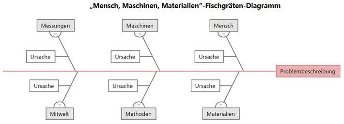 Ein Fischgrät-Diagramm mit den Kategorien: Mensch, Maschinen, Materialien, Methoden, Messungen, Milieu (Umfeld)