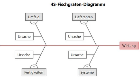 Ein Fischgrät-Diagramm mit vier Kategorien als Ursachen: Lieferanten, Systeme, Umfeld, Fertigkeiten