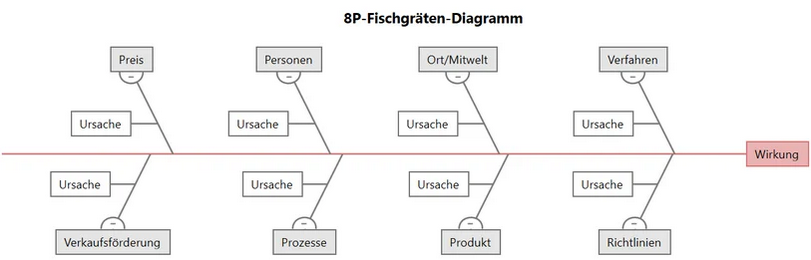 Ein Fischgrät-Diagramm mit acht Kategorien als Ursachen: Verfahren, Richtlinien, Ort/Werk, Produkt, Personen, Prozesse, Preis, Verkaufsförderung