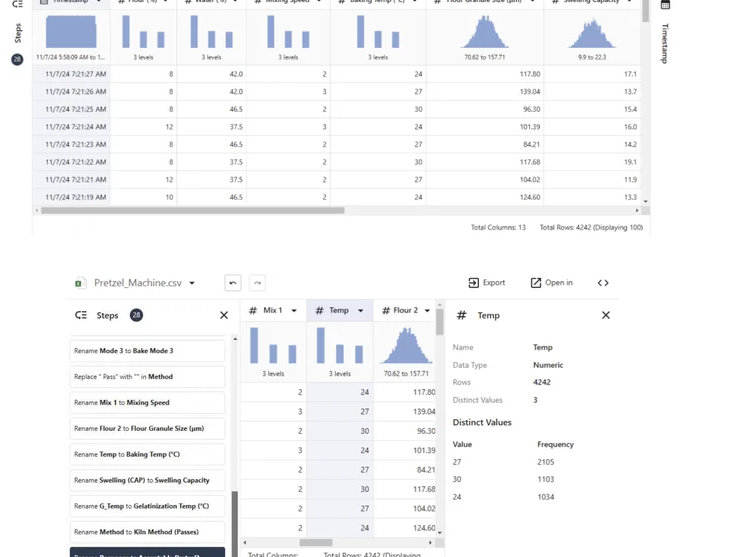 Zusammenfassende Statistiken, Visualisierungen und wiederholbare Operationen können miteinander kombiniert werden. So können beispielsweise Datentypen und Anzahl Dezimalstellen geändert werden.
