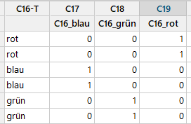 Für die Abbildung unten wurde in der Spalte 16-T mit "Daten mit Mustern erzeugen" Texte erstellt. Mit "Indikator erstellen" wird für jeden eindeutigen Text (blau, grün, rot) eine eigene Spalte erzeugt. In dieser Spalte wird eine 1 eingetragen wenn der Text vorkommt und eine 0 wenn nicht.