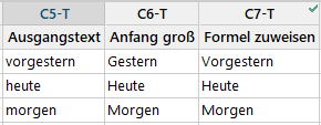 Im Beispiel unten war der ursprüngliche Ausgangstext der Spalte C5-T gestern, heute, morgen. Mit der Textfunktion "Erster Buchstabe groß" ("PROPER") wurde zunächst das Ergebnis in Spalte C6-T gespeichert. Mit der gleichen Textfunktion, diesmal mit der Option "Formel zuweisen" gesetzt, wurde das Ergebnis in Spalte C7-T gespeichert.