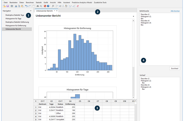 Enthält die Historie der ausgeführten Funktionen, auf die leicht zurückgegriffen werden kann. Mit der rechten Maustaste lässt sich die Ausgabe in andere Anwendungen übertragen (Word, Powerpoint, Berichte). Mehrere Ausgaben können in einer geteilten Ansicht angezeigt werden, bspw. für Vergleiche.